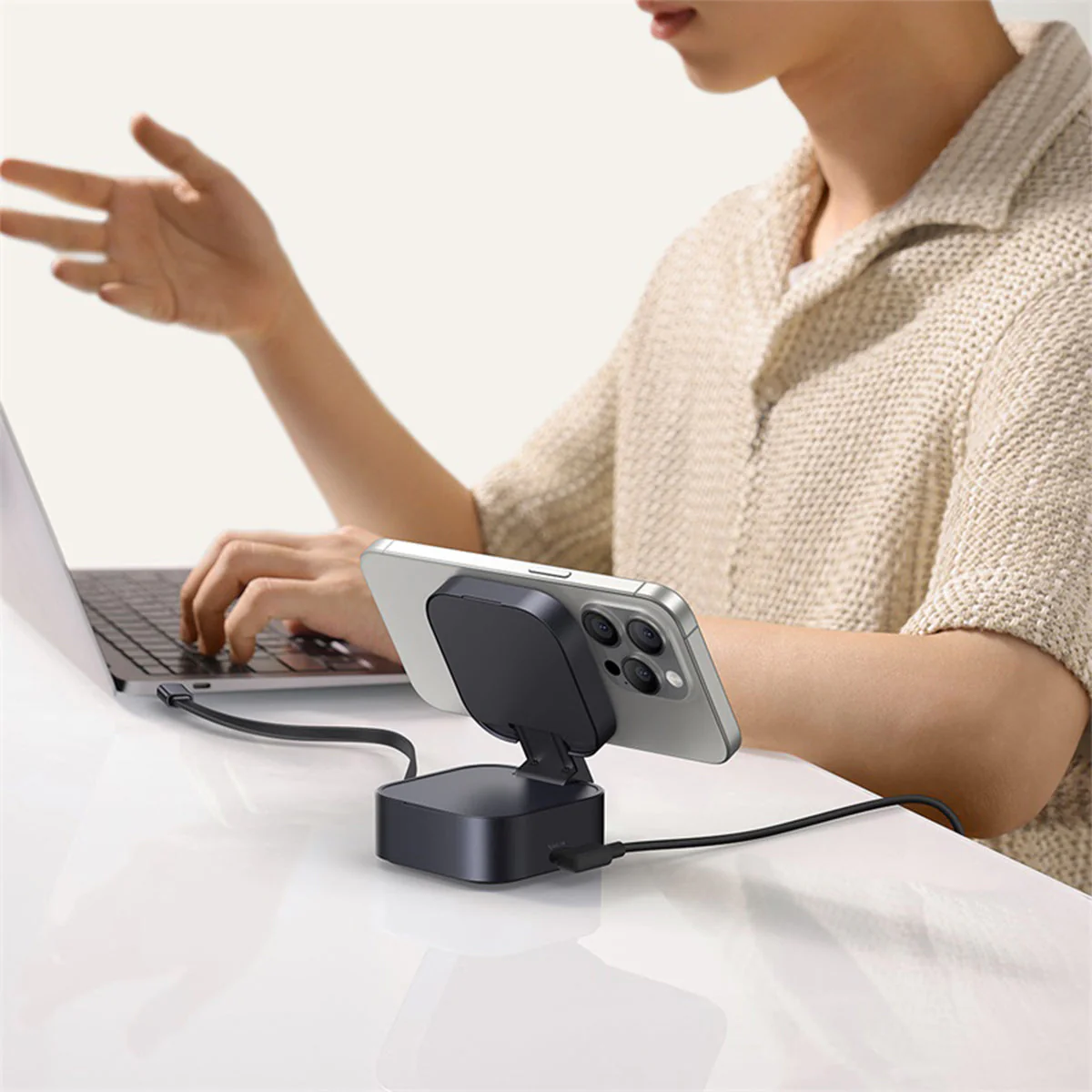 کابل USB-C داخلی به صورت خودکار جمع می‌شود. طول مناسب برای استفاده راحت دارد. از گره خوردن و آسیب دیدن جلوگیری می‌کند. فضای کاری شما را منظم نگه می‌دارد. مکانیزم جمع‌شوندگی بادوام است. هزاران بار استفاده را تحمل می‌کند. نیاز به کابل جداگانه را از بین می‌برد.