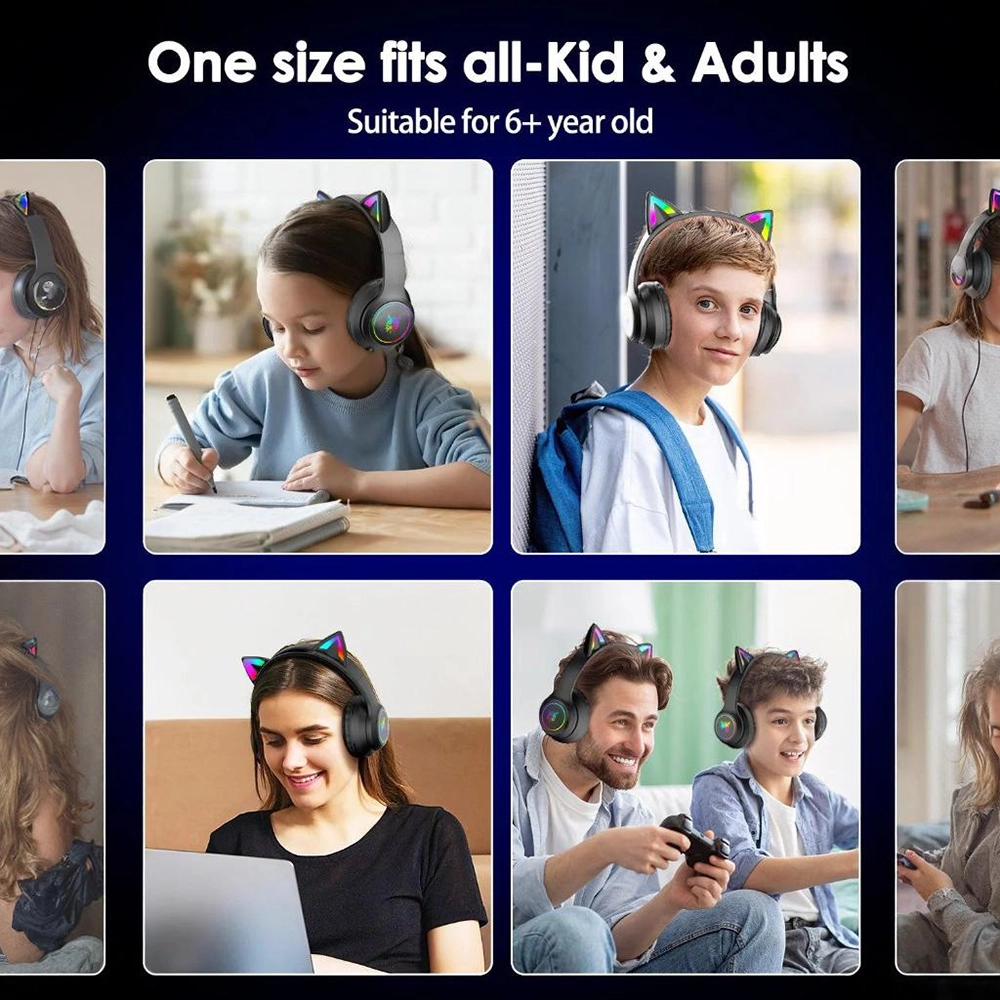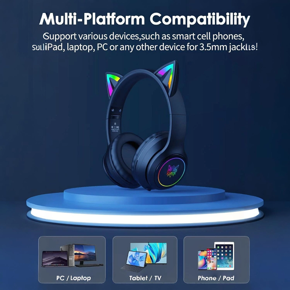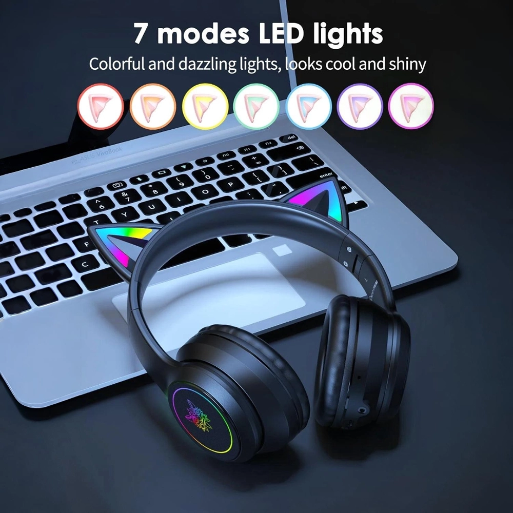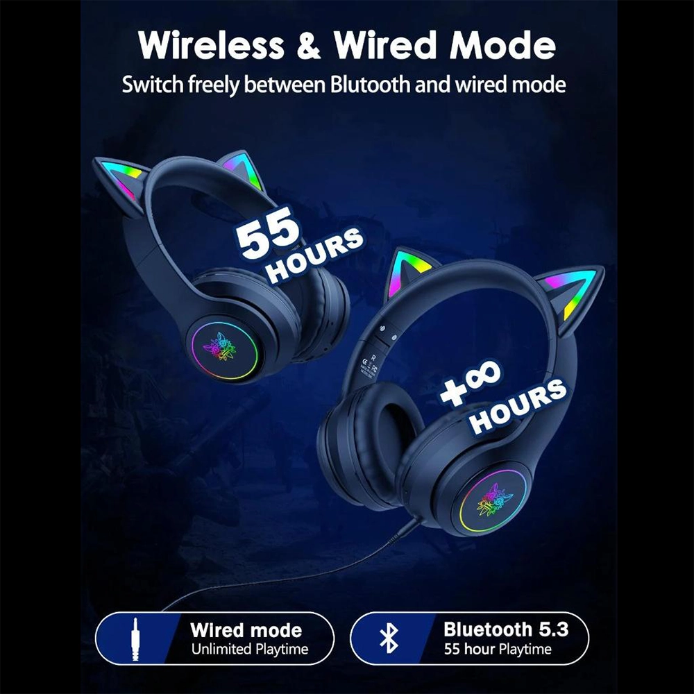 هدست گیمینگ بیسیم اونیکوما مدل B90 با گوش‌های گربه‌ای RGB و نورپردازی رنگین‌کمان طراحی شده است. باتری قدرتمند تا 7.5 ساعت پخش مداوم ارائه می‌دهد و بلوتوث 5.0 اتصال پایدار برقرار می‌کند.