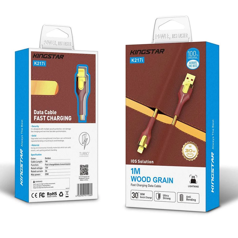 روکش پلاستیک بافته شده کابل K217i استحکام فوق‌العاده‌ای دارد. این طراحی از پارگی، گره خوردگی و فرسودگی جلوگیری می‌کند. رنگ طلایی و قرمز طرح چوب ظاهری شیک و منحصربه‌فرد ایجاد می‌نماید. کابل شارژ کینگ استار برای استفاده طولانی‌مدت طراحی شده است.