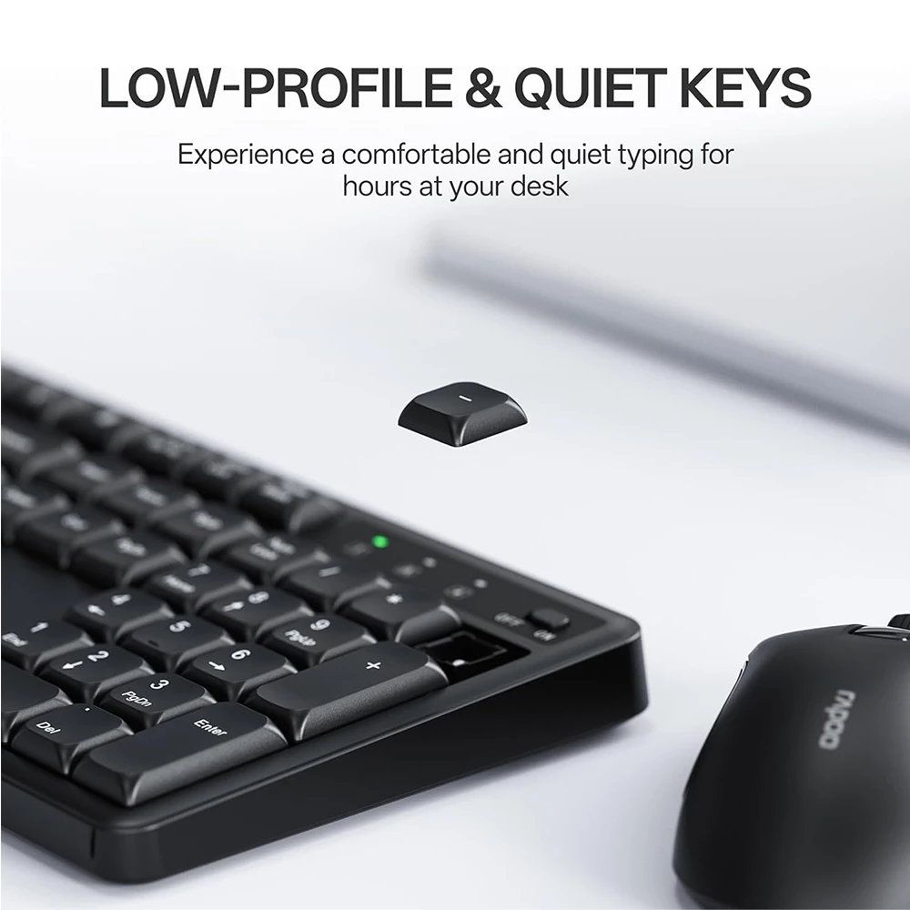 کیبورد و ماوس بی سیم رپو مدل X2100 Wireless صدای تایپ را تا 90 درصد کاهش می‌دهد. کلیدهای کم‌ارتفاع و فرورفته، احساس لمس دلپذیری را ارائه می‌کنند. این ویژگی برای محیط‌های اداری و کتابخانه‌ها ایده‌آل است. تمرکز شما و همکارانتان دیگر مختل نخواهد شد.